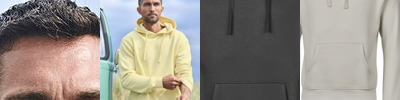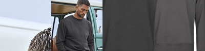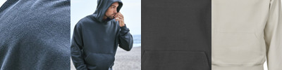Loose fit. Brushed inside. Half-moon for personalised branding. Ribs with elastane. Double dyed. Double pre-shrunk. Three-thread fabric. Certified organic cotton.